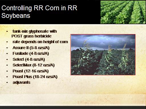Controlling RR Corn in RR Soybeans<BR> tank-mix glyphosate with POST grass herbicide <BR> rate depends on height of corn <BR> Assure II (5-8 ozs/A) <BR> Fusilade (4-8 ozs/A) <BR> Select (4-8 ozs/A) <BR> SelectMax (8-12 ozs/A) <BR> Poast (12-16 ozs/A) <BR> Poast Plus (18-24 ozs/A) <BR> adjuvants <BR>