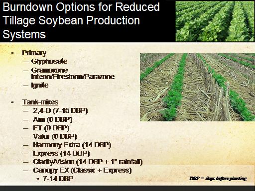 Burndown Options for Reduced Tillage Soybean Production Systems<BR> Primary <BR>Glyphosate <BR>Gramoxone Inteon/Firestorm/Parazone <BR>Ignite <BR> <BR> Tank-mixes <BR> 2,4-D (7-15 DBP) <BR> Aim (0 DBP) <BR> ET (0 DBP) <BR> Valor (0 DBP) <BR> Harmony Extra (14 DBP) <BR> Express (14 DBP) <BR> Clarity/Vision (14 DBP + 1” rainfall)  <BR> Canopy EX (Classic + Express) <BR>7-14 DBP<BR>DBP = days before planting<BR>
