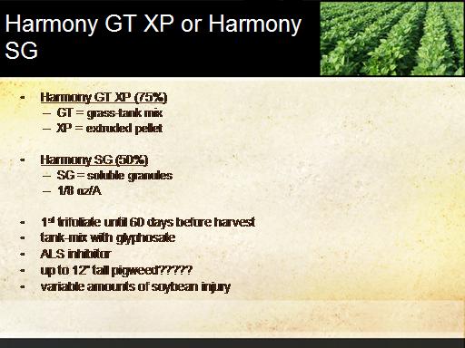 Harmony GT XP or Harmony SG<BR> Harmony GT XP (75%) <BR>GT = grass-tank mix <BR>XP = extruded pellet <BR> <BR> Harmony SG (50%) <BR>SG = soluble granules <BR>1/8 oz/A <BR> <BR> 1st trifoliate until 60 days before harvest <BR> tank-mix with glyphosate <BR> ALS inhibitor <BR> up to 12” tall pigweed????? <BR> variable amounts of soybean injury <BR> <BR>