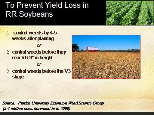 To Prevent Yield Loss in RR Soybeans<BR> control weeds by 4-5 weeks after planting <BR>or <BR>control weeds before they reach 6-9” in height <BR>or <BR>control weeds before the V3 stage<BR>Source:  Purdue University Extension Weed Science Group <BR>(5.4 million acres harvested in in 2008)<BR>