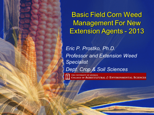 Eric P. Prostko, Ph.D. <BR>Professor and Extension Weed Specialist <BR>Dept. Crop & Soil Sciences <BR>Basic Field Corn Weed Management For New Extension Agents - 2013 <BR>