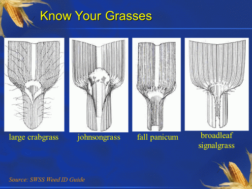 Know Your Grasses<BR>large crabgrass<BR>johnsongrass<BR>fall panicum<BR>broadleaf <BR>signalgrass<BR>Source: SWSS Weed ID Guide<BR>