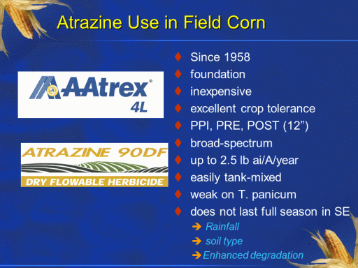 Atrazine Use in Field Corn<BR> Since 1958  <BR> foundation  <BR> inexpensive <BR> excellent crop tolerance <BR> PPI, PRE, POST (12”) <BR> broad-spectrum <BR> up to 2.5 lb ai/A/year <BR> easily tank-mixed <BR> weak on T. panicum <BR> does not last full season in SE <BR> Rainfall <BR> soil type <BR>Enhanced degradation<BR>