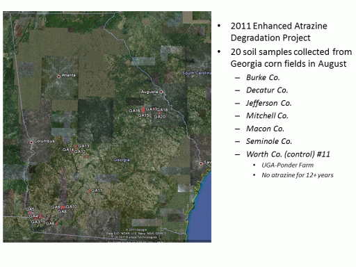 2011 Enhanced Atrazine Degradation Project <BR>20 soil samples collected from Georgia corn fields in August <BR>Burke Co. <BR>Decatur Co. <BR>Jefferson Co. <BR>Mitchell Co. <BR>Macon Co. <BR>Seminole Co. <BR>Worth Co. (control) #11 <BR>UGA-Ponder Farm <BR>No atrazine for 12+ years <BR>