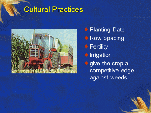 Cultural Practices<BR>Planting Date <BR>Row Spacing <BR>Fertility <BR>Irrigation <BR>give the crop a competitive edge against weeds<BR>