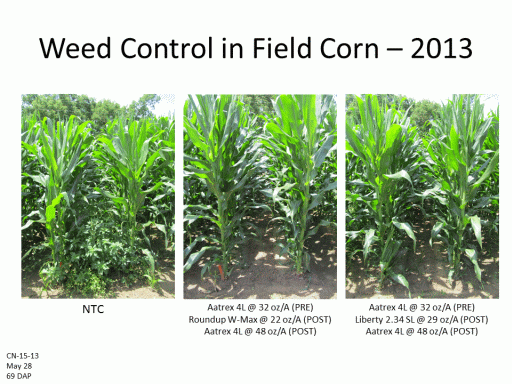 Weed Control in Field Corn – 2013<BR>CN-15-13 <BR>May 28 <BR>69 DAP<BR>NTC<BR>Aatrex 4L @ 32 oz/A (PRE) <BR>Roundup W-Max @ 22 oz/A (POST) <BR>Aatrex 4L @ 48 oz/A (POST)<BR>Aatrex 4L @ 32 oz/A (PRE) <BR>Liberty 2.34 SL @ 29 oz/A (POST) <BR>Aatrex 4L @ 48 oz/A (POST)<BR>