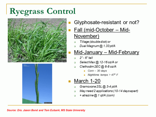 Ryegrass Control<BR>Glyphosate-resistant or not? <BR>Fall (mid-October – Mid-November) <BR>Tillage (double disk) or <BR>Dual Magnum @ 1.33 pt/A <BR>Mid-January – Mid-February <BR>2” - 6” tall <BR>Select Max @ 12-16 oz/A or <BR>Clethodim 2EC @ 6-8 oz/A <BR>Corn – 30 days <BR>Nighttime temps > 470 F <BR>March 1-20 <BR>Gramoxone 2SL @ 3-4 pt/A <BR>May need 2 applications (10-14 days apart) <BR>+ atrazine @ 1 qt/A (corn) <BR> <BR>Source: Drs. Jason Bond and Tom Eubank, MS State University<BR>