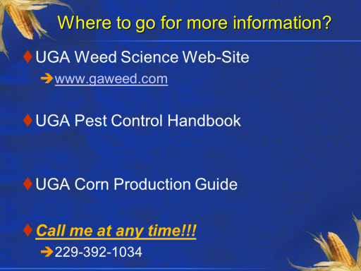Where to go for more information?<BR>UGA Weed Science Web-Site <BR>www.gaweed.com <BR> <BR>UGA Pest Control Handbook <BR> <BR> <BR>UGA Corn Production Guide <BR> <BR>Call me at any time!!! <BR>229-392-1034<BR>