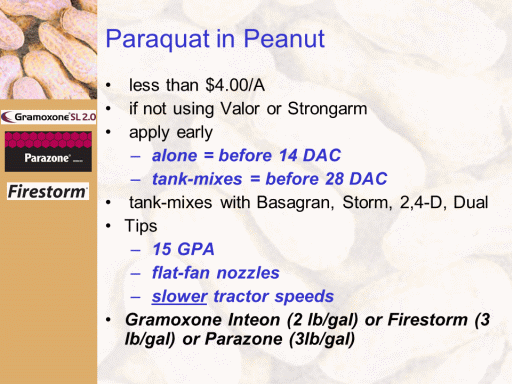 Paraquat in Peanut<BR> less than $4.00/A  <BR> if not using Valor or Strongarm <BR> apply early  <BR> alone = before 14 DAC  <BR> tank-mixes = before 28 DAC <BR> tank-mixes with Basagran, Storm, 2,4-D, Dual <BR>Tips <BR> 15 GPA <BR> flat-fan nozzles <BR> slower tractor speeds <BR>Gramoxone Inteon (2 lb/gal) or Firestorm (3 lb/gal) or Parazone (3lb/gal)<BR>