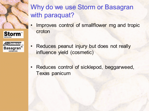 Why do we use Storm or Basagran with paraquat?<BR>Improves control of smallflower mg and tropic croton <BR> <BR>Reduces peanut injury but does not really influence yield (cosmetic) <BR> <BR>Reduces control of sicklepod, beggarweed, Texas panicum<BR>
