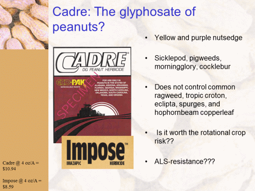Cadre: The glyphosate of peanuts?<BR>Yellow and purple nutsedge <BR> <BR>Sicklepod, pigweeds, morningglory, cocklebur <BR> <BR>Does not control common ragweed, tropic croton, eclipta, spurges, and hophornbeam copperleaf <BR> <BR> Is it worth the rotational crop risk?? <BR> <BR>ALS-resistance??? <BR>Cadre @ 4 oz/A = $10.94 <BR> <BR>Impose @ 4 oz/A = $8.59<BR>