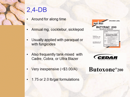 2,4-DB<BR>Around for along time <BR> <BR>Annual mg, cocklebur, sicklepod <BR> <BR>Usually applied with paraquat or with fungicides <BR> <BR>Also frequently tank-mixed  with Cadre, Cobra, or Ultra Blazer <BR> <BR>Very inexpensive (<$3.00/A) <BR> <BR>1.75 or 2.0 lb/gal formulations <BR> <BR> <BR> <BR> <BR> <BR>