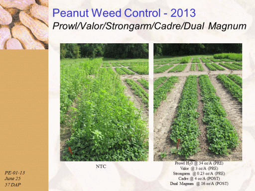 Peanut Weed Control - 2013 Prowl/Valor/Strongarm/Cadre/Dual Magnum<BR>PE-01-13 <BR>June 25 <BR>57 DAP<BR>NTC<BR>Prowl H20 @ 34 oz/A (PRE) <BR>Valor @ 3 oz/A (PRE) <BR>Strongarm @ 0.23 oz/A (PRE) <BR>Cadre @ 4 oz/A (POST) <BR>Dual Magnum @ 16 oz/A (POST)<BR>