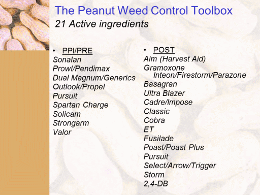 The Peanut Weed Control Toolbox 21 Active ingredients<BR>PPI/PRE <BR>Sonalan <BR>Prowl/Pendimax <BR>Dual Magnum/Generics <BR>Outlook/Propel <BR>Pursuit <BR>Spartan Charge <BR>Solicam <BR>Strongarm <BR>Valor <BR>POST <BR>Aim (Harvest Aid) <BR>Gramoxone Inteon/Firestorm/Parazone <BR>Basagran <BR>Ultra Blazer <BR>Cadre/Impose <BR>Classic <BR>Cobra <BR>ET <BR>Fusilade <BR>Poast/Poast Plus <BR>Pursuit <BR>Select/Arrow/Trigger <BR>Storm <BR>2,4-DB <BR>