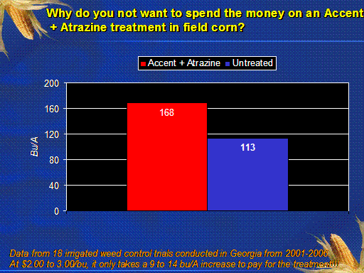 Why do you not want to spend the money on an Accent  + Atrazine treatment in field corn?<BR>Data from 18 irrigated weed control trials conducted in Georgia from 2001-2006. <BR>At $2.00 to 3.00/bu, it only takes a 9 to 14 bu/A increase to pay for the treatment!!!<BR>