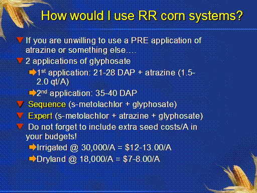 How would I use RR corn systems?<BR>If you are unwilling to use a PRE application of atrazine or something else…. <BR>2 applications of glyphosate <BR>1st application: 21-28 DAP + atrazine (1.5-2.0 qt/A) <BR>2nd application: 35-40 DAP <BR> Sequence (s-metolachlor + glyphosate) <BR> Expert (s-metolachlor + atrazine + glyphosate) <BR> Do not forget to include extra seed costs/A in your budgets! <BR>Irrigated @ 30,000/A = $12-13.00/A <BR>Dryland @ 18,000/A = $7-8.00/A <BR>