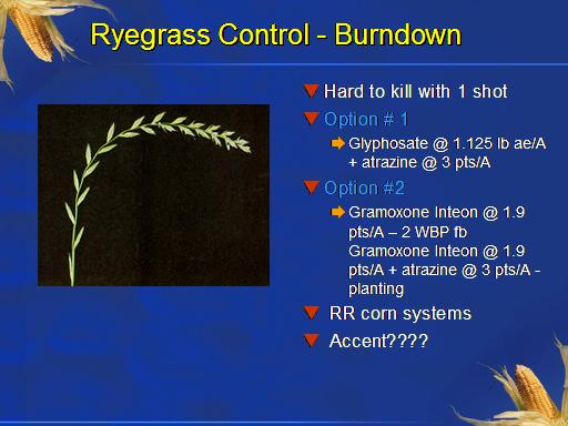 Ryegrass Control - Burndown<BR>Hard to kill with 1 shot <BR>Option # 1 <BR>Glyphosate @ 1.125 lb ae/A + atrazine @ 3 pts/A <BR>Option #2 <BR>Gramoxone Inteon @ 1.9 pts/A – 2 WBP fb Gramoxone Inteon @ 1.9 pts/A + atrazine @ 3 pts/A - planting <BR> RR corn systems <BR> Accent???? <BR>