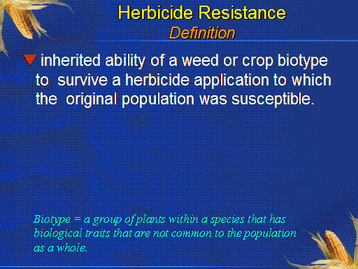 Herbicide Resistance Definition<BR> inherited ability of a weed or crop biotype to  survive a herbicide application to which the  original population was susceptible. <BR>Biotype = a group of plants within a species that has  <BR>biological traits that are not common to the population  <BR>as a whole.<BR>