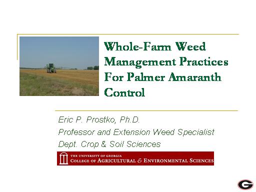 Eric P. Prostko, Ph.D. <BR>Professor and Extension Weed Specialist <BR>Dept. Crop & Soil Sciences <BR>Whole-Farm Weed Management Practices For Palmer Amaranth Control<BR>