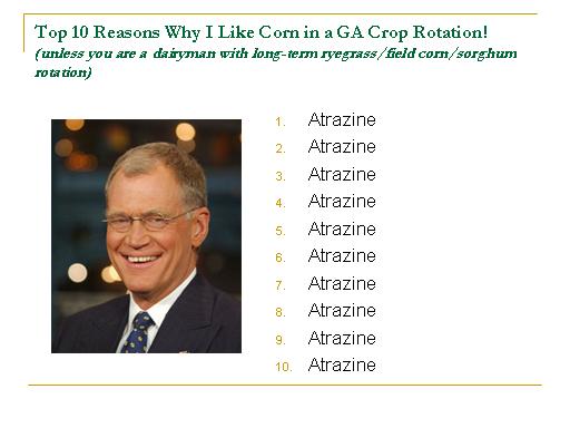 Top 10 Reasons Why I Like Corn in a GA Crop Rotation!  (unless you are a dairyman with long-term ryegrass/field corn/sorghum rotation)<BR>Atrazine <BR>Atrazine <BR>Atrazine <BR>Atrazine <BR>Atrazine <BR>Atrazine <BR>Atrazine <BR>Atrazine <BR>Atrazine <BR>Atrazine<BR>