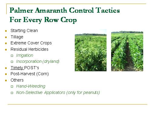 Palmer Amaranth Control Tactics For Every Row Crop<BR>Starting Clean <BR>Tillage <BR>Extreme Cover Crops <BR>Residual Herbicides <BR>Irrigation <BR>Incorporation (dryland) <BR>Timely POST’s <BR>Post-Harvest (Corn) <BR>Others <BR>Hand-Weeding <BR>Non-Selective Applicators (only for peanuts)<BR>