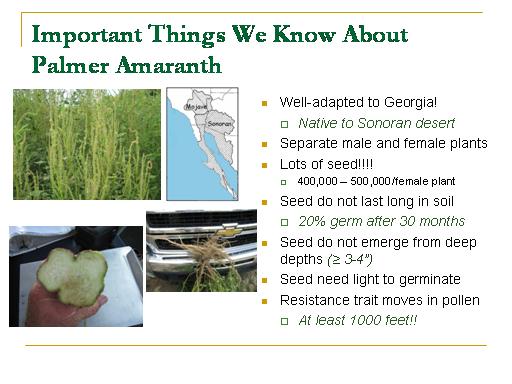 Important Things We Know About Palmer Amaranth<BR>Well-adapted to Georgia! <BR>Native to Sonoran desert <BR>Separate male and female plants <BR>Lots of seed!!!! <BR>400,000 – 500,000/female plant <BR>Seed do not last long in soil <BR>20% germ after 30 months <BR>Seed do not emerge from deep depths (= 3-4”) <BR>Seed need light to germinate <BR>Resistance trait moves in pollen <BR>At least 1000 feet!!<BR>