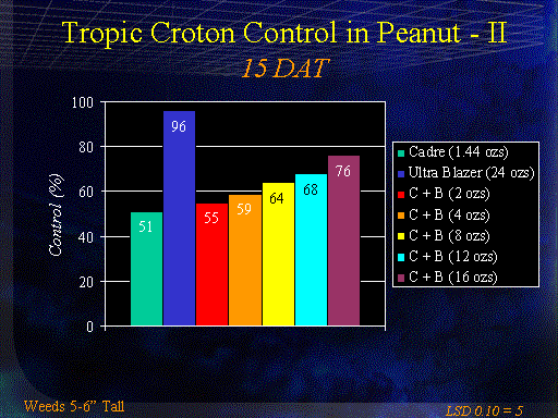 Tropic Croton Control in Peanut - II15 DAT<BR>Weeds 5-6” Tall<BR>LSD 0.10 = 5<BR>