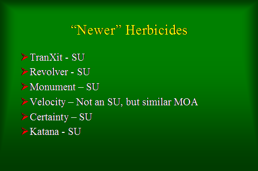 “Newer” Herbicides<BR>TranXit - SU <BR>Revolver - SU <BR>Monument – SU <BR>Velocity – Not an SU, but similar MOA <BR>Certainty – SU <BR>Katana - SU<BR>