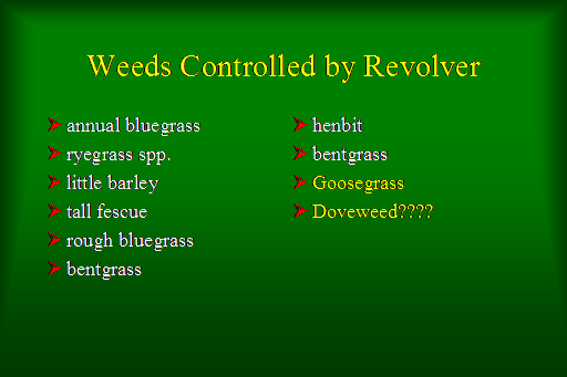 Weeds Controlled by Revolver<BR>annual bluegrass <BR>ryegrass spp. <BR>little barley <BR>tall fescue <BR>rough bluegrass <BR>bentgrass<BR>henbit <BR>bentgrass <BR>Goosegrass <BR>Doveweed????<BR>