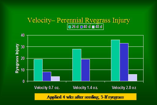 Velocity– Perennial Ryegrass Injury<BR>Applied 4 wks after seeding, 3-lf ryegrass<BR>