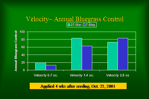 Velocity– Annual Bluegrass Control<BR>Applied 4 wks after seeding, Oct. 23, 2001<BR>