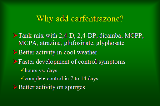 Why add carfentrazone?<BR>Tank-mix with 2,4-D, 2,4-DP, dicamba, MCPP, MCPA, atrazine, glufosinate, glyphosate <BR>Better activity in cool weather <BR>Faster development of control symptoms <BR>hours vs. days <BR>complete control in 7 to 14 days <BR>Better activity on spurges<BR>