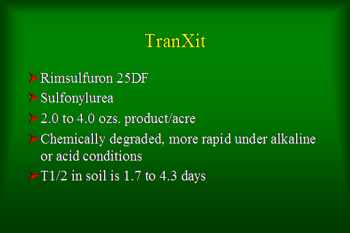 TranXit<BR>Rimsulfuron 25DF <BR>Sulfonylurea <BR>2.0 to 4.0 ozs. product/acre <BR>Chemically degraded, more rapid under alkaline or acid conditions <BR>T1/2 in soil is 1.7 to 4.3 days <BR>