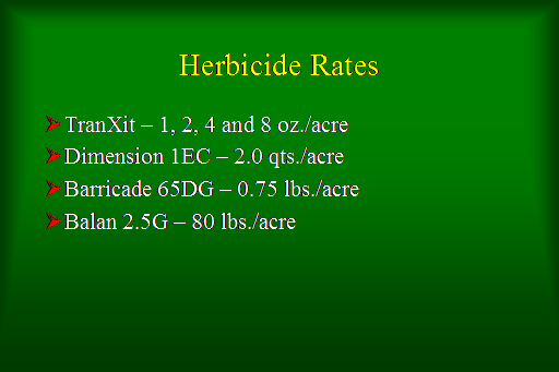 Herbicide Rates<BR>TranXit – 1, 2, 4 and 8 oz./acre <BR>Dimension 1EC – 2.0 qts./acre <BR>Barricade 65DG – 0.75 lbs./acre <BR>Balan 2.5G – 80 lbs./acre<BR>