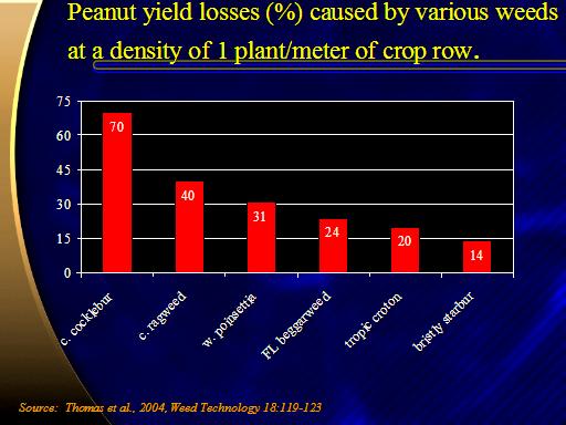 Peanut yield losses (%) caused by various weeds at a density of 1 plant/meter of crop row.<BR>Source:  Thomas et al., 2004, Weed Technology 18:119-123<BR>