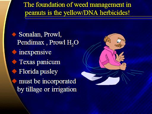 The foundation of weed management in peanuts is the yellow/DNA herbicides!<BR> Sonalan, Prowl, Pendimax , Prowl H2O