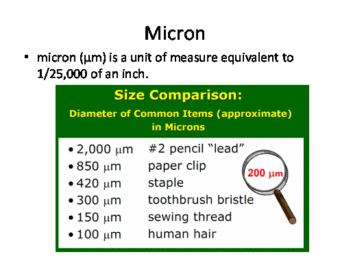 Micron<BR>micron (µm) is a unit of measure equivalent to 1/25,000 of an inch. <BR>