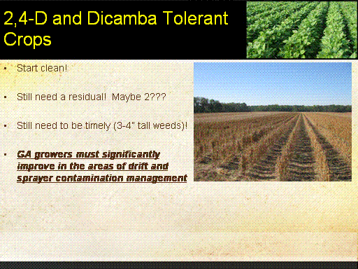 2,4-D and Dicamba Tolerant Crops<BR>Start clean! <BR> <BR>Still need a residual!  Maybe 2??? <BR> <BR>Still need to be timely (3-4” tall weeds)! <BR> <BR>GA growers must significantly improve in the areas of drift and sprayer contamination management  <BR>