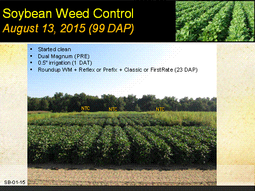 Soybean Weed Control August 13, 2015 (99 DAP)<BR>NTC<BR>NTC<BR>NTC<BR>SB-01-15<BR>Started clean <BR>Dual Magnum (PRE) <BR>0.5” irrigation (1 DAT) <BR>Roundup WM + Reflex or Prefix + Classic or FirstRate (23 DAP)<BR>