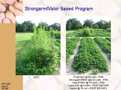 Strongarm/Valor Based Program<BR>NTC<BR>Prowl H2O @ 34 oz/A – PRE <BR>Strongarm 84WG @ 0.23 oz/A - PRE <BR>Valor 51WG @ 1.5 oz/A – PRE <BR>Cadre 2AS @ 4 oz/A – POST (29 DAP) <BR>Agrioil @ 1% v/v – POST (29 DAP) <BR>PE-14-09 <BR>July 23 <BR>56 DAP<BR>
