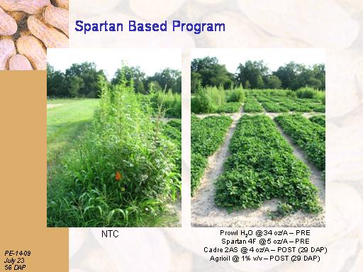 Spartan Based Program<BR>NTC<BR>Prowl H2O @ 34 oz/A – PRE <BR>Spartan 4F @ 5 oz/A – PRE <BR>Cadre 2AS @ 4 oz/A – POST (29 DAP) <BR>Agrioil @ 1% v/v – POST (29 DAP)<BR>PE-14-09 <BR>July 23 <BR>56 DAP<BR>