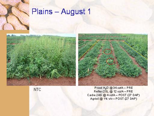Plains – August 1<BR>NTC<BR>Prowl H2O @ 34 oz/A – PRE <BR>Reflex 2SL @ 12 oz/A – PRE <BR>Cadre 2AS @ 4 oz/A – POST (27 DAP) <BR>Agrioil @ 1% v/v – POST (27 DAP)<BR>
