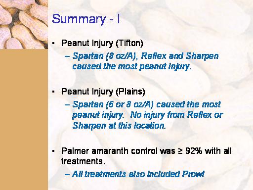 Summary - I<BR>Peanut Injury (Tifton) <BR>Spartan (8 oz/A), Reflex and Sharpen caused the most peanut injury. <BR> <BR>Peanut Injury (Plains) <BR>Spartan (6 or 8 oz/A) caused the most peanut injury.  No injury from Reflex or Sharpen at this location. <BR> <BR>Palmer amaranth control was = 92% with all treatments. <BR>All treatments also included Prowl<BR>