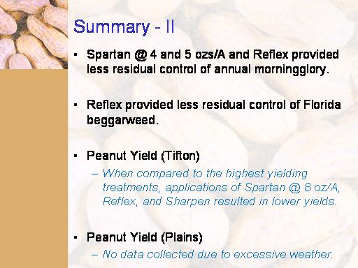 Summary - II<BR>Spartan @ 4 and 5 ozs/A and Reflex provided less residual control of annual morningglory. <BR> <BR>Reflex provided less residual control of Florida beggarweed. <BR> <BR>Peanut Yield (Tifton) <BR>When compared to the highest yielding treatments, applications of Spartan @ 8 oz/A, Reflex, and Sharpen resulted in lower yields. <BR> <BR>Peanut Yield (Plains) <BR>No data collected due to excessive weather. <BR> <BR>