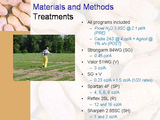 Materials and Methods Treatments<BR>All programs included <BR>Prowl H2O 3.8SC @ 2.1 pt/A (PRE) <BR>Cadre 2AS @ 4 oz/A + Agrioil @ 1% v/v (POST) <BR>Strongarm 84WG (SG) <BR>0.45 oz/A <BR>Valor 51WG (V) <BR>3 oz/A <BR>SG + V <BR>0.23 oz/A + 1.5 oz/A (1/2X rates) <BR>Spartan 4F (SP) <BR>4, 5, 6, 8 oz/A <BR>Reflex 2SL (R) <BR>12 and 16 oz/A <BR>Sharpen 2.85SC (SH) <BR>1 and 2 oz/A <BR>