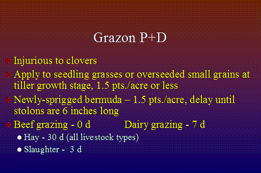 Grazon P+D<BR>Injurious to clovers <BR>Apply to seedling grasses or overseeded small grains at tiller growth stage, 1.5 pts./acre or less <BR>Newly-sprigged bermuda – 1.5 pts./acre, delay until stolons are 6 inches long <BR>Beef grazing - 0 d		Dairy grazing - 7 d <BR>Hay - 30 d (all livestock types) <BR>Slaughter -  3 d <BR> <BR>