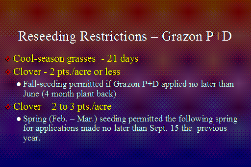 Reseeding Restrictions – Grazon P+D<BR>Cool-season grasses  - 21 days <BR>Clover - 2 pts./acre or less <BR>Fall-seeding permitted if Grazon P+D applied no later than June (4 month plant back) <BR>Clover – 2 to 3 pts./acre <BR>Spring (Feb. – Mar.) seeding permitted the following spring for applications made no later than Sept. 15 the  previous year. <BR>
