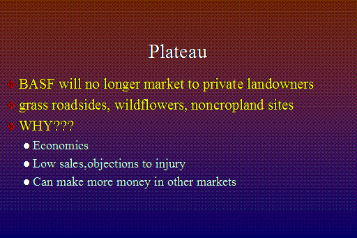 Plateau<BR>BASF will no longer market to private landowners <BR>grass roadsides, wildflowers, noncropland sites <BR>WHY??? <BR>Economics <BR>Low sales,objections to injury <BR>Can make more money in other markets<BR>