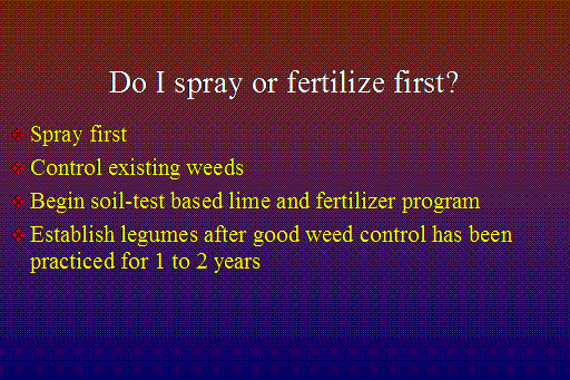 Do I spray or fertilize first?<BR>Spray first <BR>Control existing weeds <BR>Begin soil-test based lime and fertilizer program <BR>Establish legumes after good weed control has been practiced for 1 to 2 years<BR>