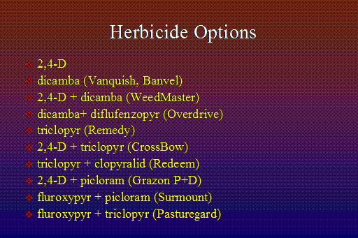 Herbicide Options<BR>2,4-D <BR>dicamba (Vanquish, Banvel) <BR>2,4-D + dicamba (WeedMaster) <BR>dicamba+ diflufenzopyr (Overdrive) <BR>triclopyr (Remedy) <BR>2,4-D + triclopyr (CrossBow) <BR>triclopyr + clopyralid (Redeem) <BR>2,4-D + picloram (Grazon P+D) <BR>fluroxypyr + picloram (Surmount) <BR>fluroxypyr + triclopyr (Pasturegard) <BR>